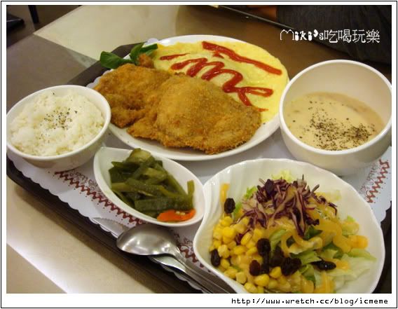 附飯、沙拉、玉米乳酪恩利蛋捲、小菜、湯品、香草蒟蒻凍、飲料